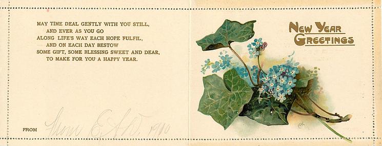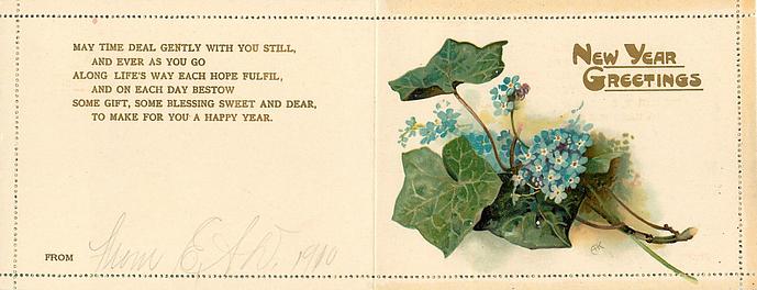 verse in gilt MAY TIME DEAL GENTLY WITH YOU STILL, AND EVER AS YOU GO ALONG LIFE'S WAY EACH HOPE FULFIL AND ON ESCH DAY BESTOW SOME GIFT, SOME BLESSING SWEET AND DEAR TO MAKE FOR YOU A HAPPY NEW YEAR