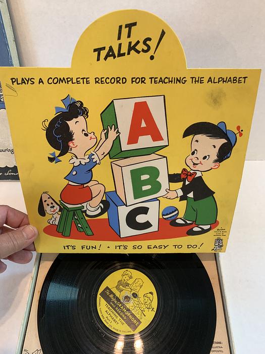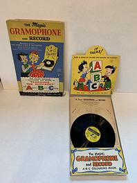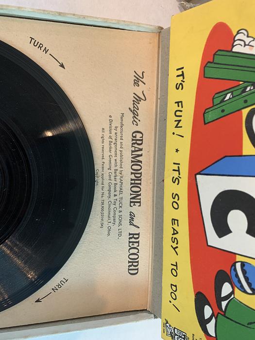 TEACHING THE ALPHABET WITH ALPHABET & BOOK FOR COLORING This is a rare pre war Raphael Tuck & Son production called The Magic Gramophone and record, in its original box complete with record . The record, which is described in the box as "made of long-life break resistant material " will play by placing the needle, which is incorporated in the cardboard insert, then inserting a pencil in a small hole in the record and spinning the record manually.