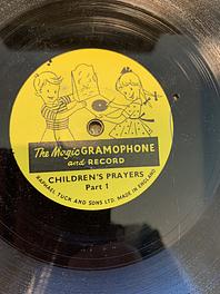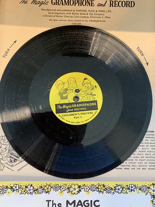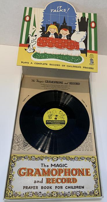 IT TALKS! PLAYS A COMPLETE RECORD OF CHILDREN'S PRAYERS. IT'S FUN, IT'S SO EASY TO DO! This is a rare pre war Raphael Tuck & Son production called The Magic Gramophone and record, in its original box complete with record . The record, which is described in the box as "made of long-life break resistant material " will play by placing the needle, which is incorporated in the cardboard insert, then inserting a pencil in a small hole in the record and spinning the record manually.