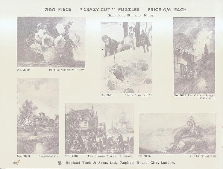 ISSUED IN SIX DIFFERENT SUBJECTS EACH CONTAINING ABOUT 140 to 150 PIECES. The box is marked RAPHAEL TUCK & SONS, LTD. LONDON, MADE IN ENGLAND The Zag-Zaw line of puzzles was first produced in 1909, all incorporate figurals or whimsies, sold in red or orange boxes with labels on the side or bottom of the box, most without guide pictures. Initially cut non-interlocking but by 1930's became more so. Puzzles have a different cuts so that the same image will come in several versions which means that missing pieces can not be taken from other puzzles with the same image. See also Bob Armstrong's website on old jigsaw puzzles.