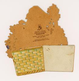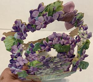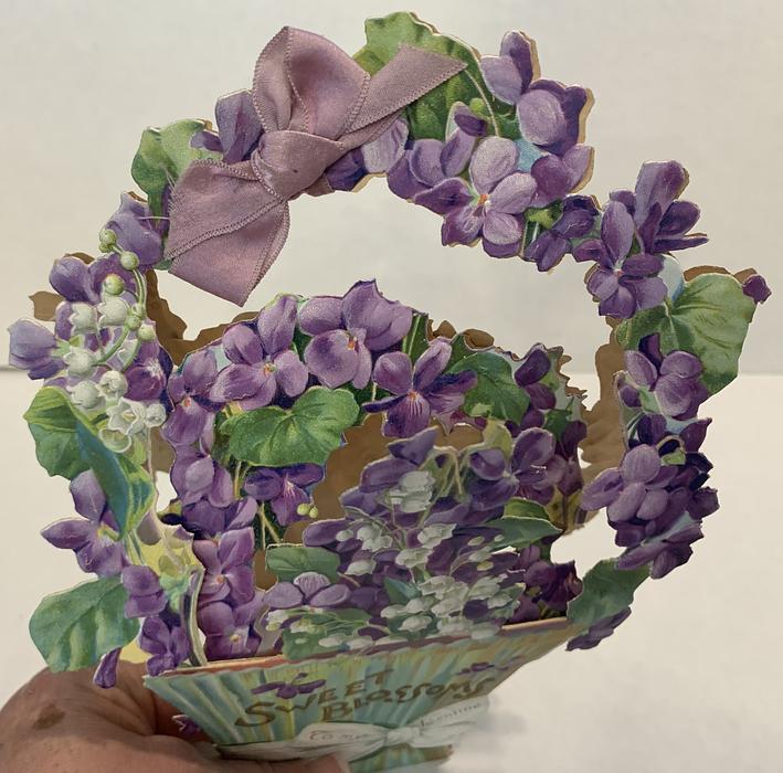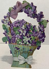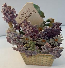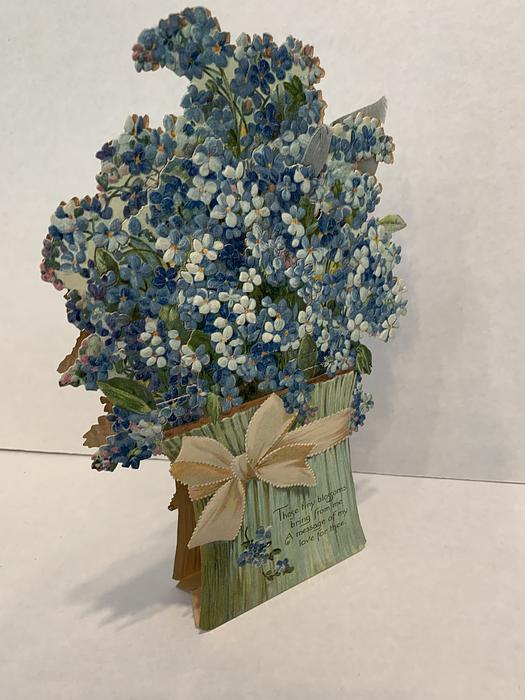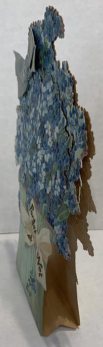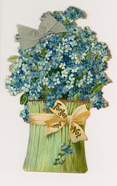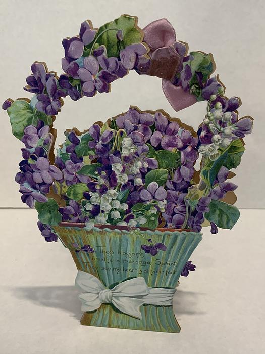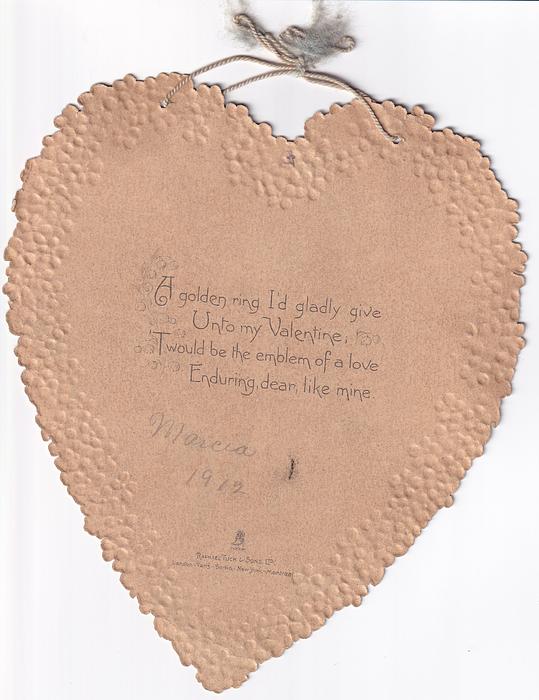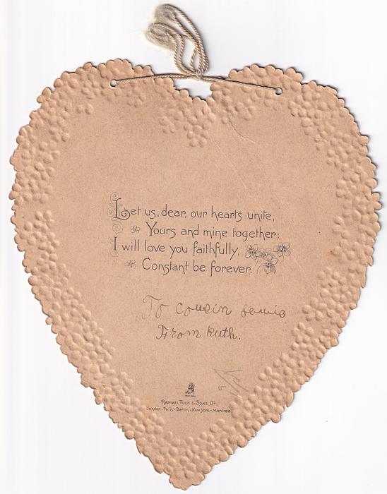 stick pin shaped with envelope, embossed die-cut stick pin with pansies at top and a series of hearts, each with a letter from V-A-L-E-N-T-I-NE ending with the stick pin. The reverse has a heart shaped flap with the Raphael Tuck logo. When lifted it reveals a message "Cloudless thy life, hadst thou but part In half the bliss Wished now for thee by the true heart That sends you this!"