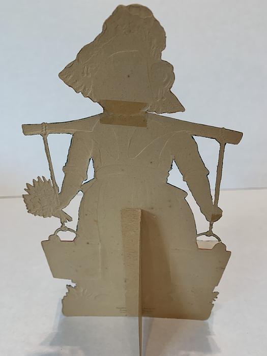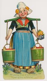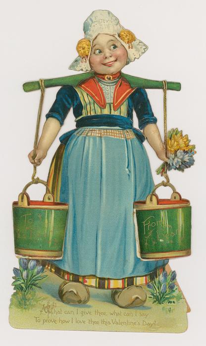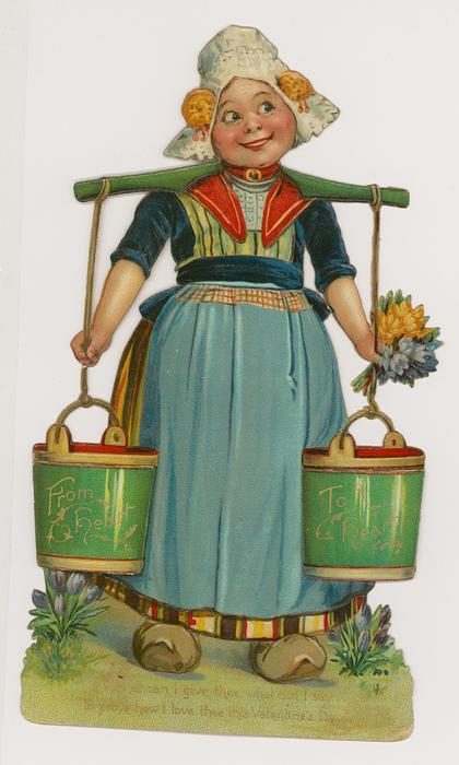 Dutch girl with a yoke on her shoulders carries two green buckets