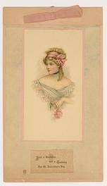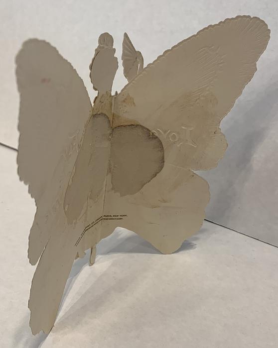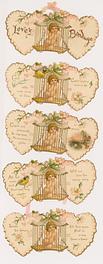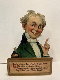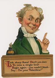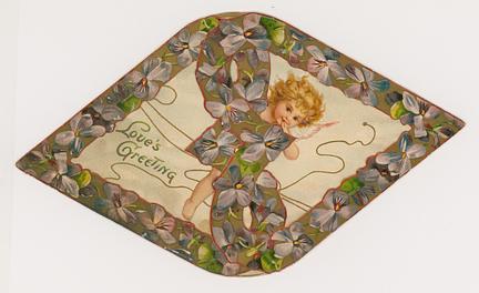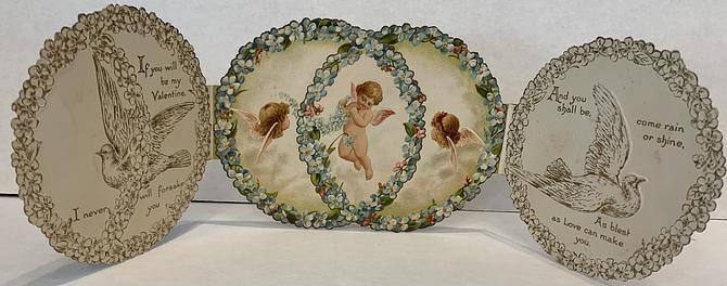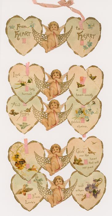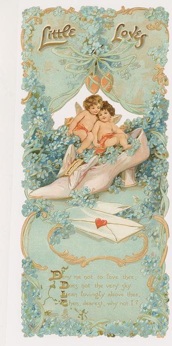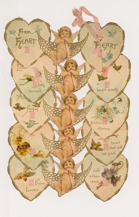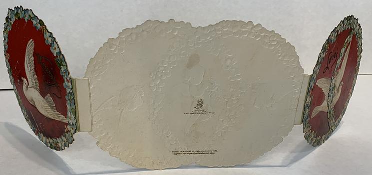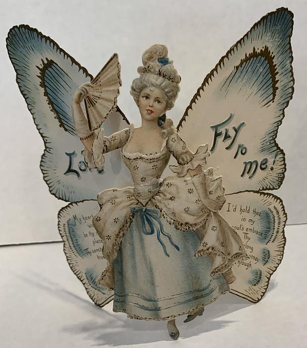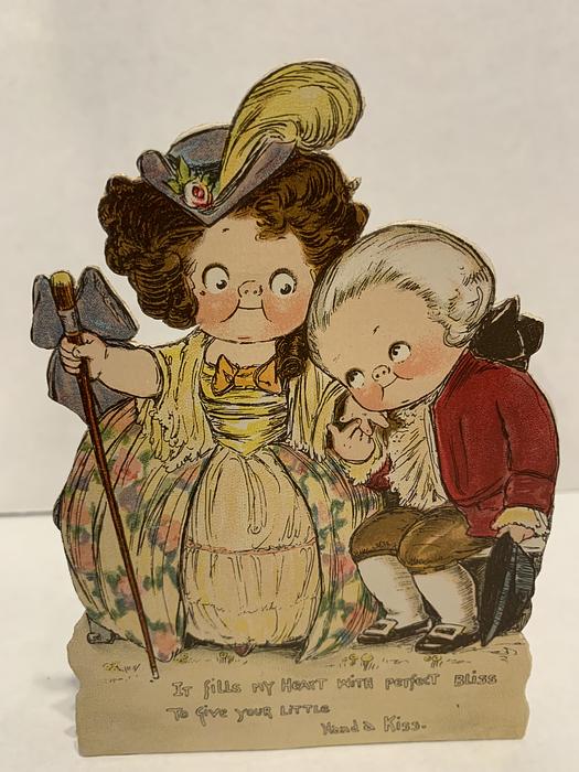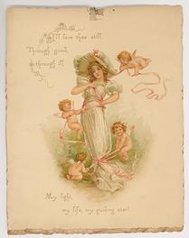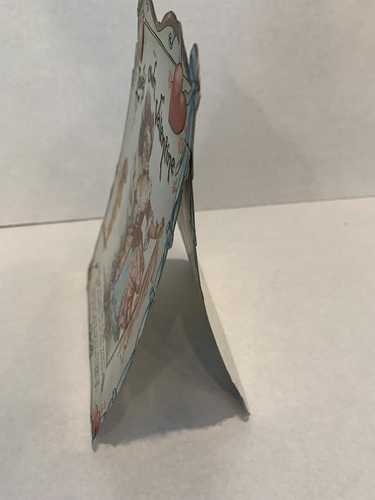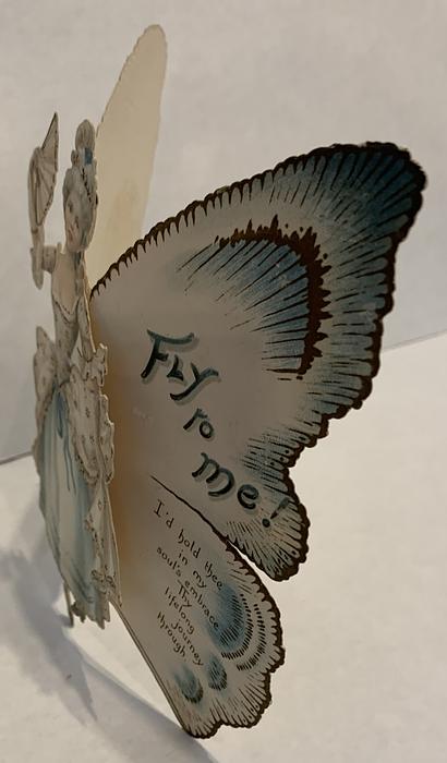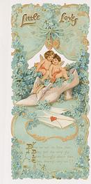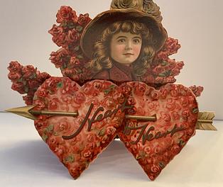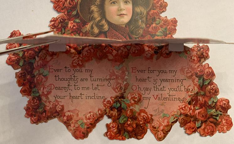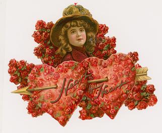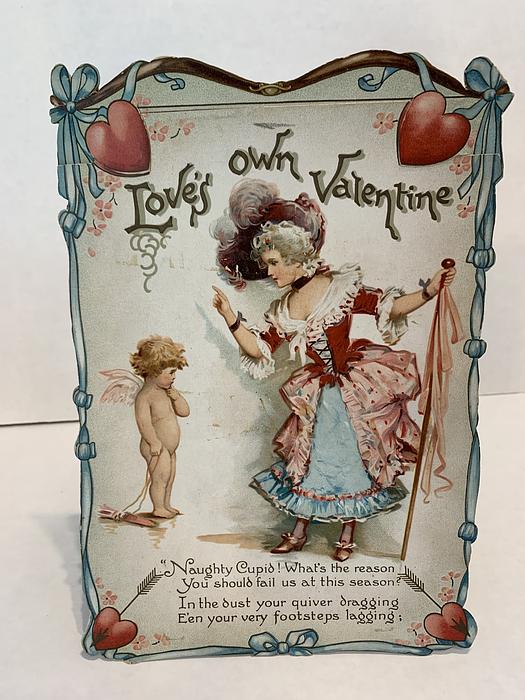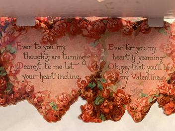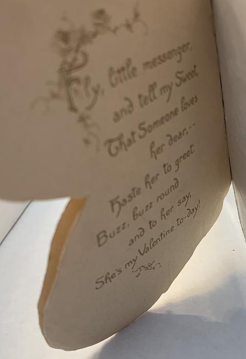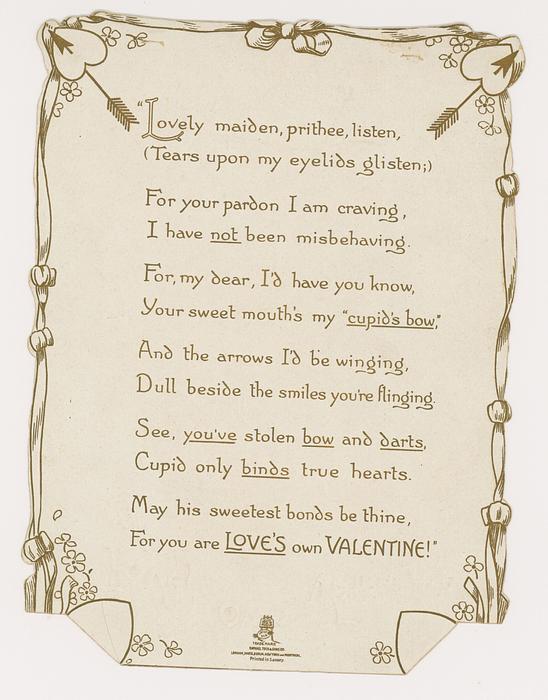 on the reverse LOVELY MAIDE, PIRTHEE, LISTEN, (TEARS UPON MY EYELIDS GLISTE) FOR YOUR PARDON I AM CRAVING, I HAVE NOT BEEN MISBEHAVING. FOR MY DEAR, I'D HAVE YOU KOW, YOUR SWEET MOUTH'S MY CUPID'S BOS, AND THE ARROWS I;D BE WINGING, DULL BESIDE THE SMILES YOU'RE FLINGING. SEE, YOU'VE STOLEN BOW AND DARTS, CUPID ONLY BINDS TRUE HEARTSL MAY HIS SWEETEST BONDS BE THINE, FOR YOU ARE LOVES OWN VALENTINE.