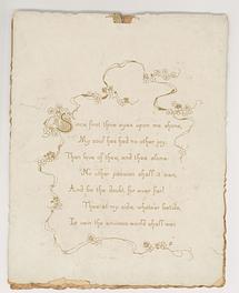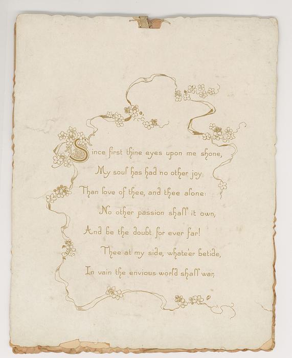 second page, SINCE FIRST THINE EYES UPON ME SHONE, MY SOUL HAS HAD NO OTHER JOY THAN LOVE OF THEE, AND THEE ALONE: NO OTHER PASSION SHALL IT OWN, AND BE THE DOUBT FOR EVER FAR! THEE AT THY SIDE, WHATE'ER BETIDE, IN VAIN THE ENVIOUS WORLD SHALL WAR.