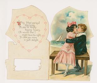 inside left. THIS LIFTED PARASOL DISCLOSES, A PAIR OF FONDLY KISSING LOVERS, OH WOULD THAT I MIGHT HAVE THE RIGHT, TO CLAIM YOU MINE IN SUCH DELIGHT