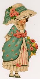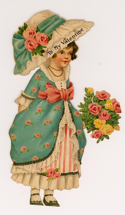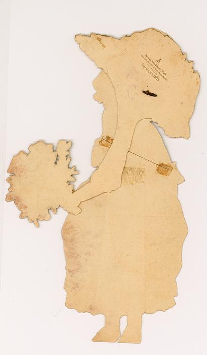 girl in blue colonial style dress, hat moves, come with and without the printed greeting