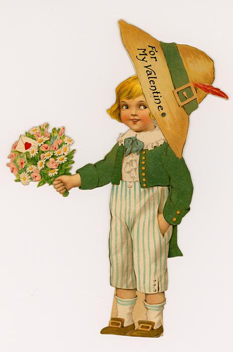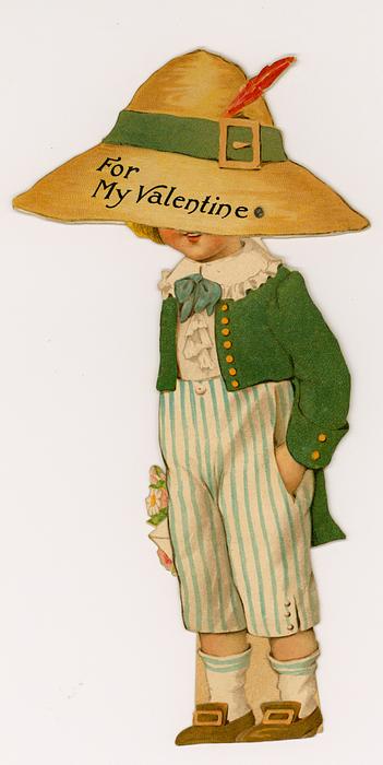 boy in blue colonial style dress holds a valentine letter and walking stick, hat moves