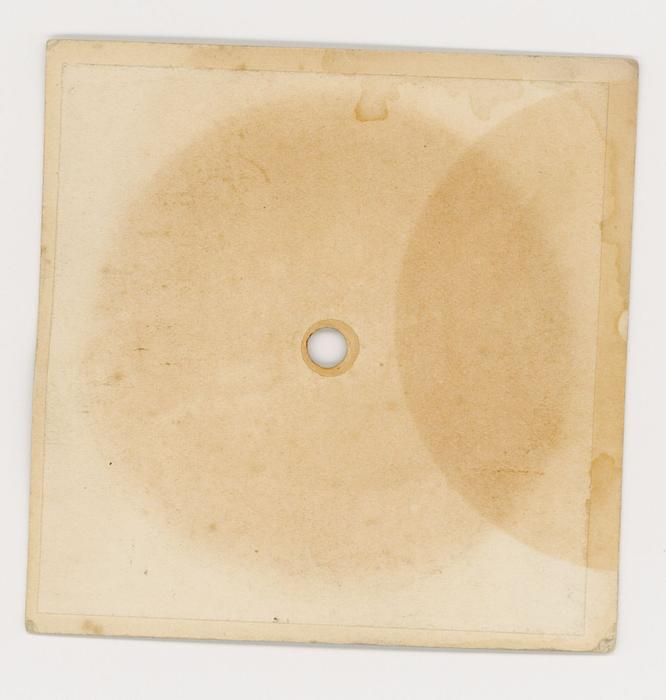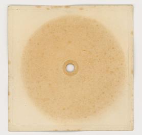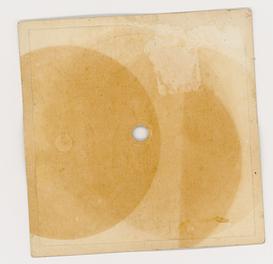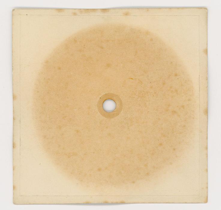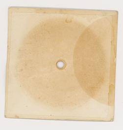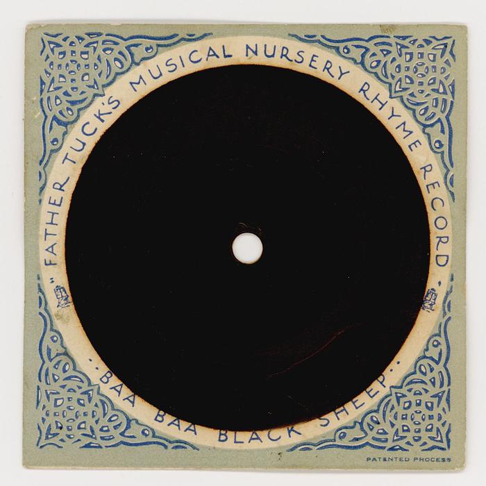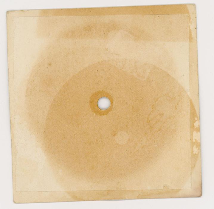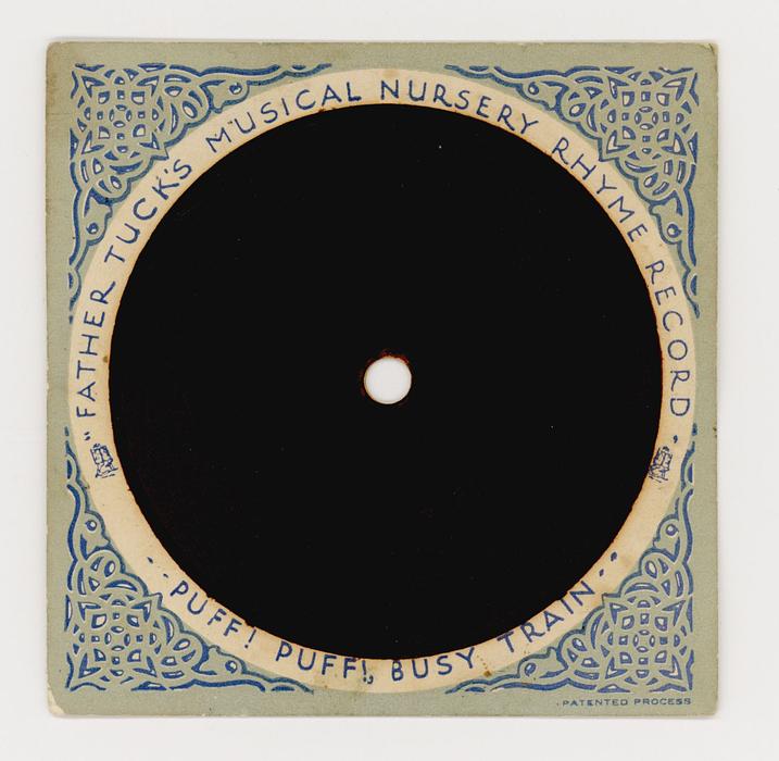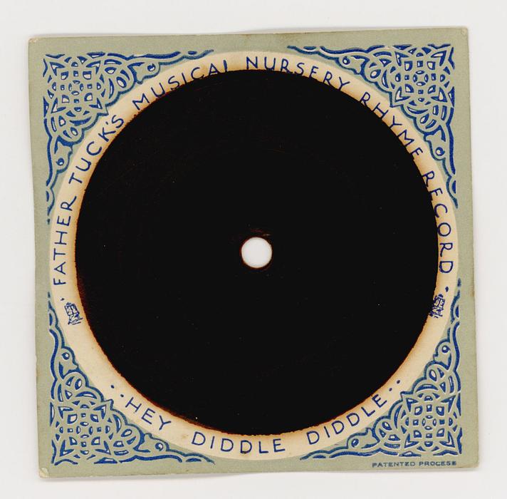 Gramophone records affixed to a square background board designed with a blue and grey design, printed PATENTED PROCESS in the bottom corner. Backs are blank, small hole in the center to place the record on a player