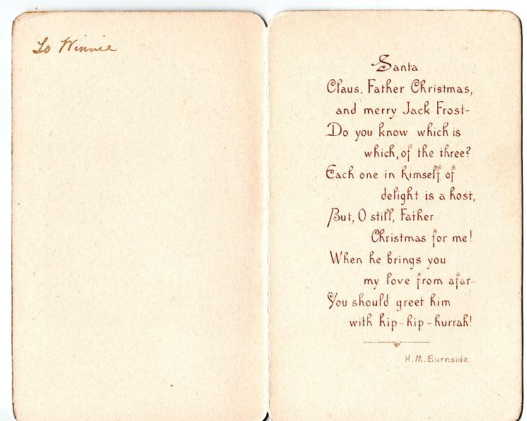 single folded inside right:- SANTA CLAUS, FATHER CHRISTMAS, AND MERRY JACK FROST - DO YOU KNOW WHICH IS WHICH, OF THE THREE? EACH ONE IN HIMSELF OF DELIGHT IS A HOST, BUT, O STILL, FATHER CHRISTMAS FOR ME! WHEN HE BRINGS FOR ME! WHEN HE BRINGS YOU MY LOVE FROM AFAR - YOU SHOULD GREET HIM WITH HIP-HIP-HURRAH!