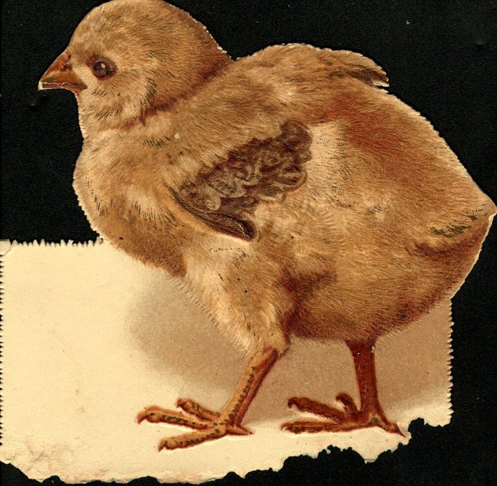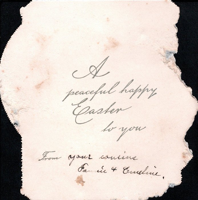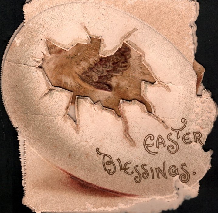 die-cut single sheet,double fold, serrated & irregular edges inside right first page:- standing chick inside right second page:- A PEACEFUL HAPPY EASTER TO YOU -- FROM
