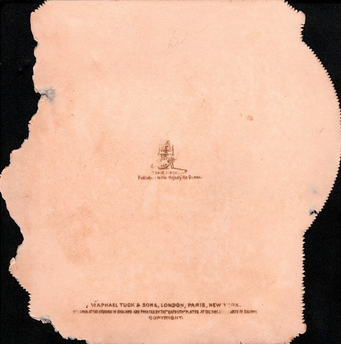 back:-logo over TRADE MARK --with or without PUBLISHERS BY SPECIAL APPOINTMENT -- with or without PUBLISHERS TO HER MAJESTY THE QUEEN -- RAPHAEL TUCK & SONS LTD -- LONDON; PARIS ; NEW YORK -- DESIGNED AT THE STUDIOS IN ENGLAND AND PRINTED BY THE "RAFOLITH" PLATES IN SAXONY -- COPYRIGHT