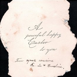die-cut single sheet, singe fold, serrated edges, embossed inside right top- MY HEART GREETS YOU below:-I LIVE BUT TO SEE THEE; I COUNT BUT THE HOURS WHERE THOU ART; I ASK - ONLY ASK - TO BE NEAR THEE ALBEIT SO FAR FROM MY HEART.