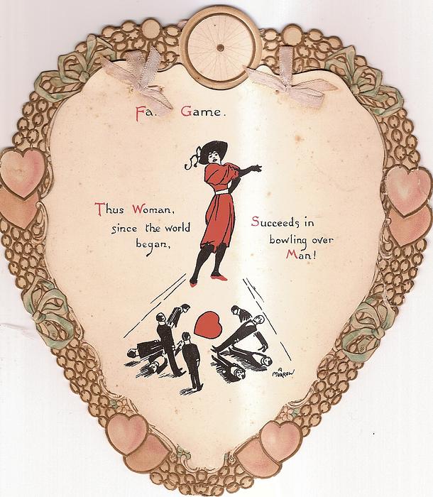 two sheets secured near top with ribbon thrown heart knocks over male bowling pins forget-me-nots behind, marginal heart design