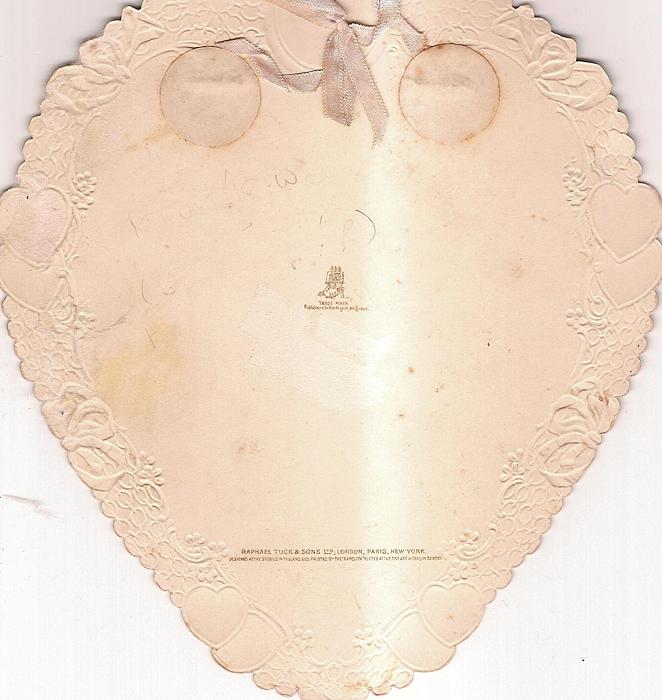die-cut single sheet, single fold inside right:, left:-MY HEART GREETS YOU. right:-GIVE ME A HEART THAT IS KIND AND TRUE, A HEART THAT HAS MANY A GENTLE WILE -I CARE NOT IF EYES BE BROWN OR BLUE.....THAT RESPONDS TO MINE