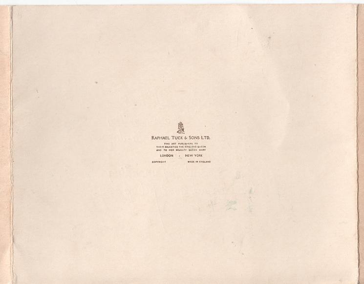 logo over RAPHAEL TUCK & SONS LTD -- PUBLISHERS BY APPOINTMENT TO THEIR MAJESTIES THE KING AND QUEEN RAPHAEL TUCK & SONS LTD -- LONDON, PARIS, NEW YORK , DESIGNED AT THE STUDIOS IN ENGLAND AND PRINTED AT THE FINE ART WORKS IN BAVARIA