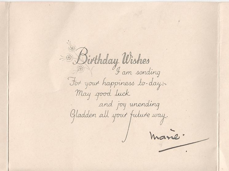 oblong cover, two folds to create left and right flaps inside right:- BIRTHDAY WISHES I AM SENDING FOR YOUR HAPPINESS TO-DAY; MAY GOOD LUCK AND JOY UNENDING GLADDEN ALL YOUR FUTURE WAY