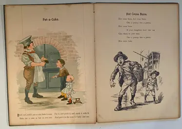 pictorial board covers with red cloth spine binding, cream colored background, RAPHAEL TUCK & SONS LTD. LONDON-PARIS-NEW YORK. PUBLISHERS BY APPOINTMENT TO THEIR MAJESTIES THE KING, AND QUEEN ALEXANDRA, DESIGNED AT THE STUDIOS IN ENGLAND AND PRINTED AT THE FINE ART WORKS IN GERMANY also comes as a cloth covered deluxe version but with no number