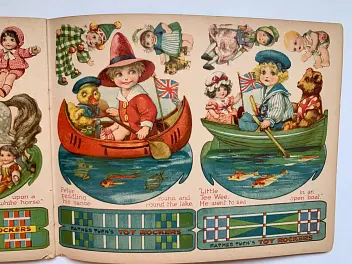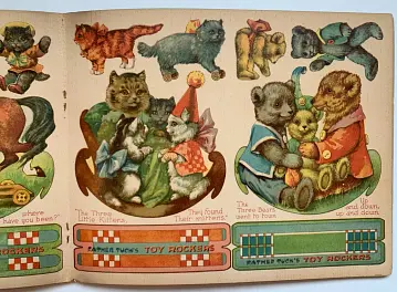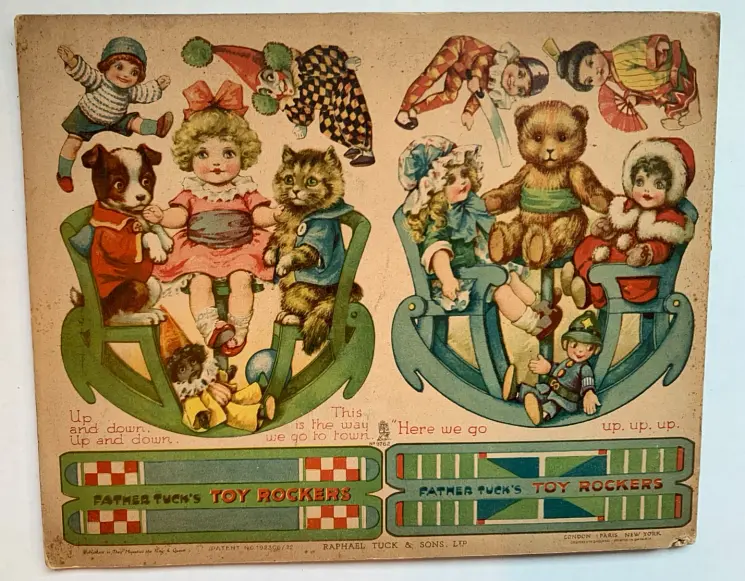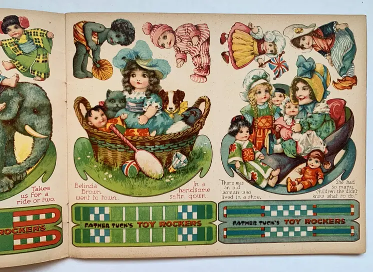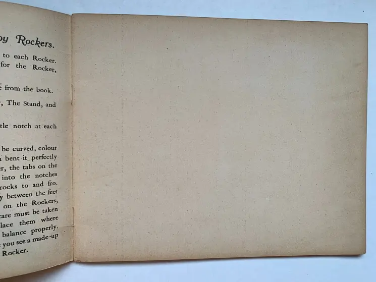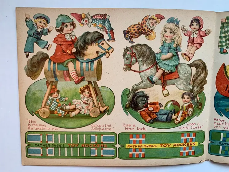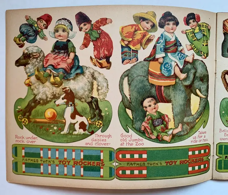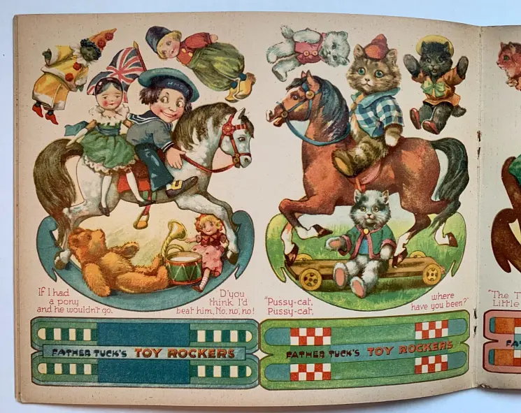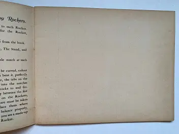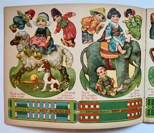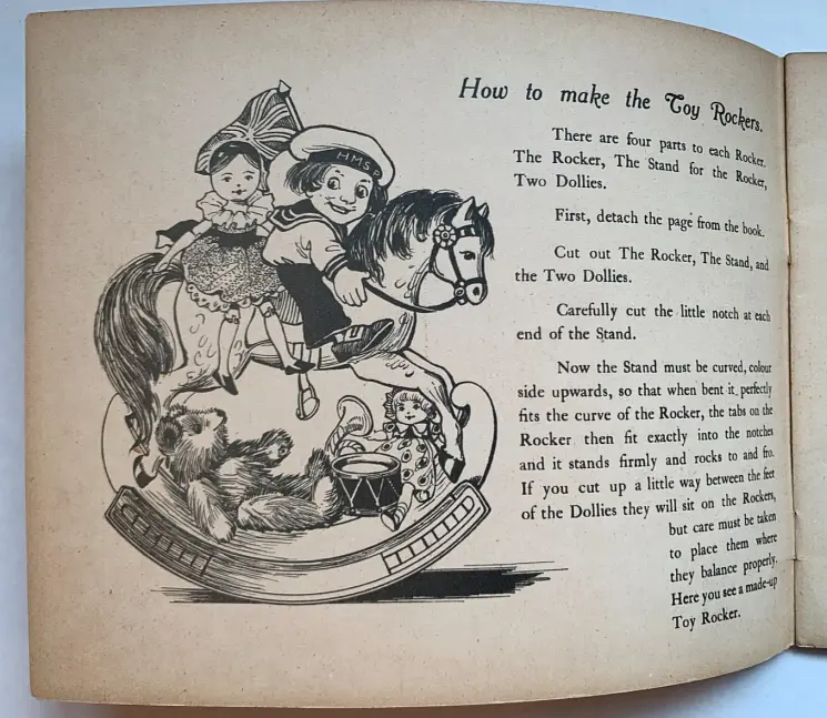 EACH BOOK CONSISTS OF A BEAUTIFUL COLOURED COVER AND HAS SEVEN PAGES OF CHARMING COLOURED PICTURES READY TO BE CUT OUT AND MADE UP INTO SEVEN LOVELY PEEP-SHOWS, HAVING A FRONT SCENE, CENTRE SCENE AND BACKGROUND SCENE. ALTHOUGH THEY ARE VERY CLEVERLY CONTRIVED, THE MAKING UP OF THEM IS A QUITE SIMPLE MATTER AND FULL DIRECTIONS ARE GIVEN IN FRONT OF EACH BOOK. A BEAUTIFUL BOOK FULL OF DELIGHTFUL TOYS, TO BE CONSTRUCTED BY AN EXTREMELY CLEVER, PATENTED, BUT VERY SIMPLE DEVICE. THERE ARE SEVEN PAGES OF LOVELY DESIGNS OF ANIMALS, DILLS AND OTHER TOYS, WHICH WHEN CUT OUT AND MADE UP GIVE FOURTEEN CHARMING MODELS OF ROCKING HORSES, ROCKING BOATS, ROCKING CHAIRS, ETC., WHICH ROCK UP AND DOWN IN A FASCINATING WAY. HERE ARE TO BE FOUND "THE THREE LITTLE KITTENS," "A FINE LADY UPON A WHITE HORSE," AND OTHER FAVOURITE NURSERY FRIENDS. THERE ARE ALSO LITTLE DOLLIES TO BE CUT OUT SEPARATELY AND PUT UPON THE ROCKERS.