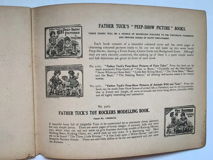 EACH BOOK CONSISTS OF A BEAUTIFUL COLOURED COVER AND HAS SEVEN PAGES OF CHARMING COLOURED PICTURES READY TO BE CUT OUT AND MADE UP INTO SEVEN LOVELY PEEP-SHOWS, HAVING A FRONT SCENE, CENTRE SCENE AND BACKGROUND SCENE. ALTHOUGH THEY ARE VERY CLEVERLY CONTRIVED, THE MAKING UP OF THEM IS A QUITE SIMPLE MATTER AND FULL DIRECTIONS ARE GIVEN IN FRONT OF EACH BOOK. FROM THIS BOOK CAN BE MADE WONDERFUL PEEP-SHOWS OF "PUSS IN BOOTS," "CINDERELLA AND THE GLASS SLIPPER, " "SNOW-WHITE AND ROSE-RED, " "LITTLE RED RIDING HOOD," "THE THREE BEARS," "BEAUTY AND THE BEAST," THE SLEEPING BEAUTY", ALL SHOWING WELL-KNOWN SCENES IN THE VARIOUS STORIES. info taken from the inside cover of 9763