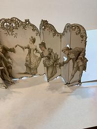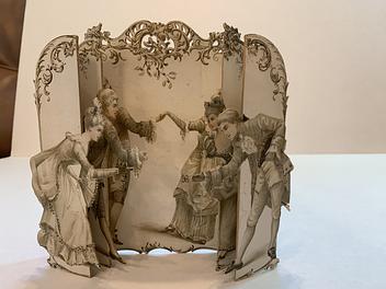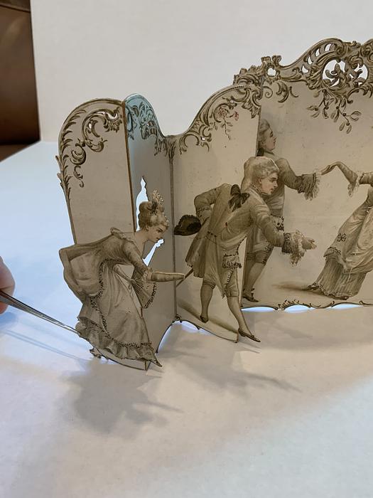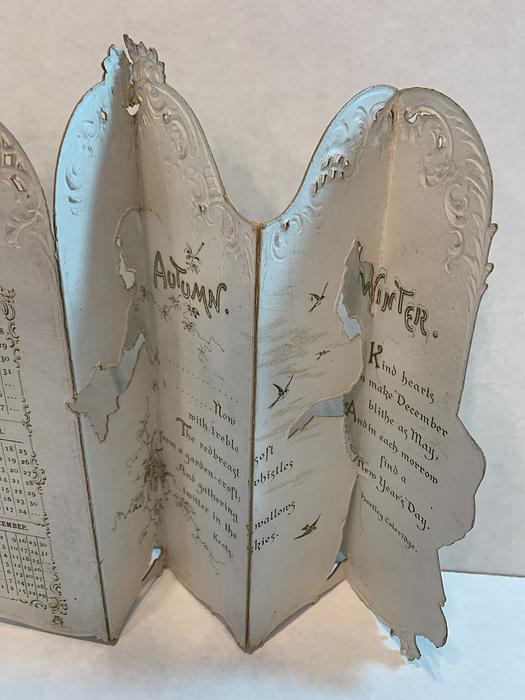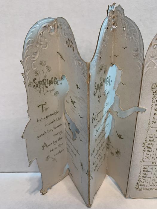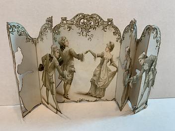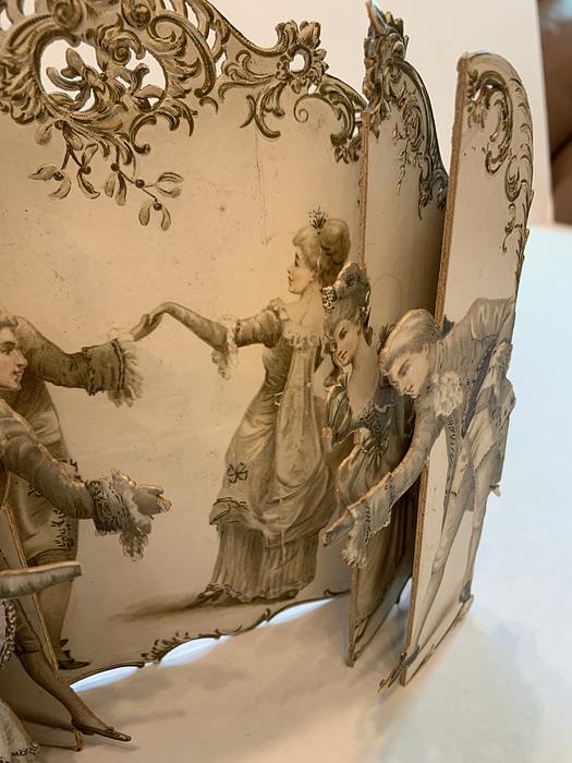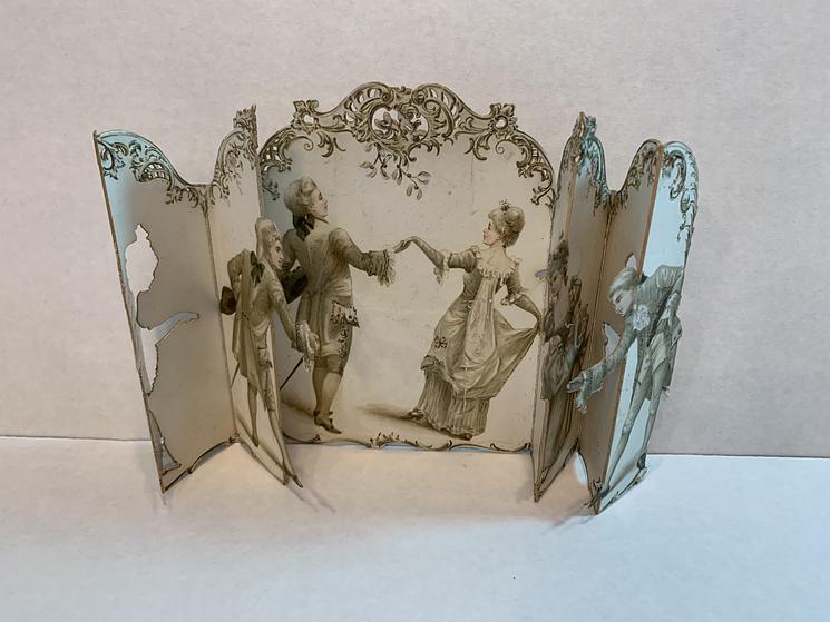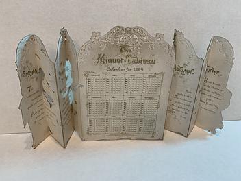 standing display calendar with side panels folding out to display three dimensional image of ladies and gentlemen dancing also comes as a 1895 calendar in a smaller size