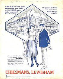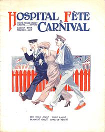 HOSPITAL FETE & CARNIVAL WHITE HOUSE CRICKET GROUND. CATFORD. AUGUST BANK HOLIDAY.1917.red white and blue image of two soldiers arm in arm with pretty girl. GEE WHIZ JACK! WHAT A GAIT BLIGHTY! GIRL!! BANG UP FETE!!!, advertising on back cover for CHIESMANS (house furnishings), LEWISHAM, RAPHAEL TUCK & SONS, LTD. LONDON, PARIS, AND NEW YORK