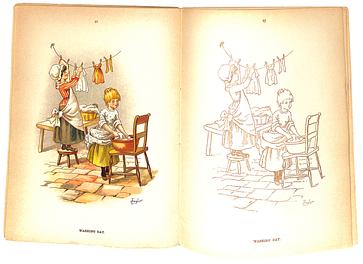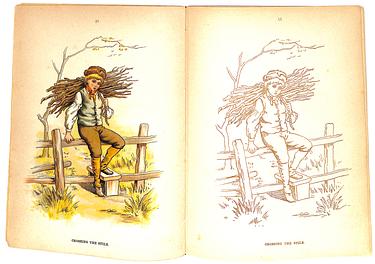 a coloring book with some pre-printed images on one side and outlines on the other, some just outlines and some blank pages for practicing