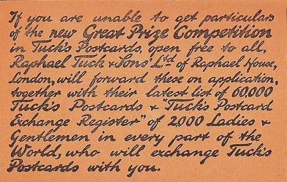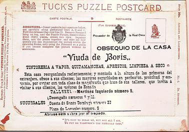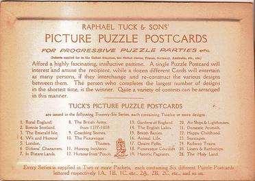PICTURE PUZZLE (PATENT APPLIED FOR), come with DIRECTIONS: INSERT PENKNIFE INTO APERTURE BELOW, CUT CAREFULLY .... RE-CONSTRUCT THE PICTURE ... USING ONLY THE POSTCARD AS A GUIDE .... advert in Spanish opt. on back, lengthy information on packet: AFFORD A HIGHLY FASCINATING, INSTRUCTIVE PASTIME .... TWENTY-SIX SERIES, EACH CONTAINING TWELVE OR MORE DESIGNS ...