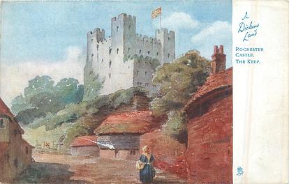 back:- ROCHESTER CASTLE IS A VENERABLE PILE-RUGGED, MASSIVE, AND IMPOSING ALTHOUGH A RUIN. IT IS DEFENDED ON ONE SIDE BY THE WATERS OF THE MEDWAY AND ON THE OTHER//THE EARL OF JERSEY same image & card title AQUARETTE 6271 IN DICKENS LAND