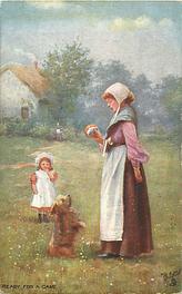 back:- THIS IS INDEED A PRETTY PICTURE-A MEADOW IN A PLEASANT COUNTRY , A LITTLE GIRL AND HER MOTHER, AND A TERRIER DOG SITTING UP BEGGING//GAME PROCEEDS THIS HAPPY AFTERNOON OILETTE on front, same image & card title OILETTE 9180 COUNTRY LIFE SERIES V