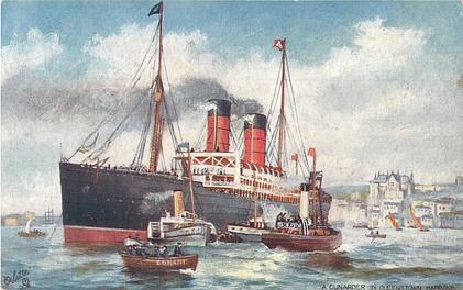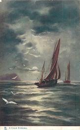 image from OILETTE, AROUND THE COAST 6694 back:- THIS PICTURE REPRESENTS A FISHING SMACK AT SEA ON A CALM EVENING IN SUMMER TIME, WITH THE MOON SHEDDING ITS SILVERY LIGHT ON THE QUIET WATERS.// THEIR OCCUPATION IS ONE OF THE HARDEST AND MOST DANGEROUS same image & card title OILETTE 9106 CELEBRATED LINERS "THE CUNARD"