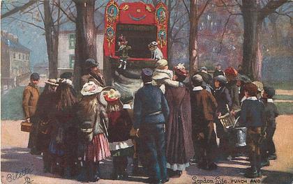 front OILETTE, this image in OILETTE 9015 LONDON LIFE back:- THE PUNCH AND JUDY SHOW IS NOT MET WITH SO FREQUENTLY IN THE STREETS OF LONDON AS IT USED TO BE SOME YEARS BACK, BUT OCCASIONALLY IN THE SUBURBS WE COME ACROSS// THE SEASIDE