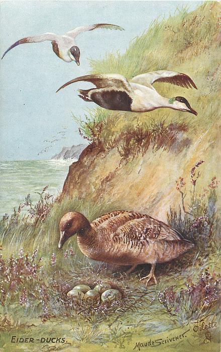 OILETTE on front back:- THE EIDER DUCK (SOMATERIA) EIDER-DOWN, THE SOFT FEATHERS THAT ARE EMPLOYED IN STUFFING QUILTS AND SUCH LIKE ARTICLES,COMES FROM THE EIDER DUCK//SMALL COMPANIES this image in OILETTE 9231 BRITISH SEA BIRDS & WILLESDEN EDUCATION COMMITTEE