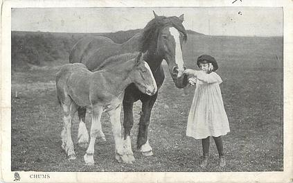 back:- THE LITTLE GIRL IN THE PICTURE HAS MANY FRIENDS AT THE FARM AMONG THE NUMEROUS ANIMALS, BUT HER FAVOURITE IS SALLY, THE MARE.//FOAL THAT YOU CAN SEE STANDING BESIDE HER this image as GLOSSO 5589 FOURFOOTED FRIENDS & for WALTHAMSTOW CLASS TEACHER'S REPORT