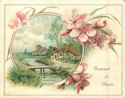 REWARD OF MERIT, rural inset farm-house, church & distant mill across stream, pink blossom surround