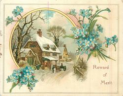 REWARD OF MERIT CARD, rural inset, snow scene, cart in front of house, forget-me-not surround