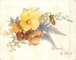REWARD OF MERIT CARD, yellow & gold pansies over silver fern