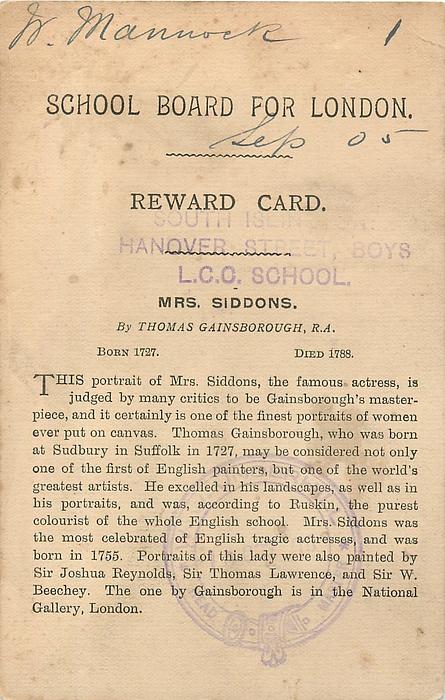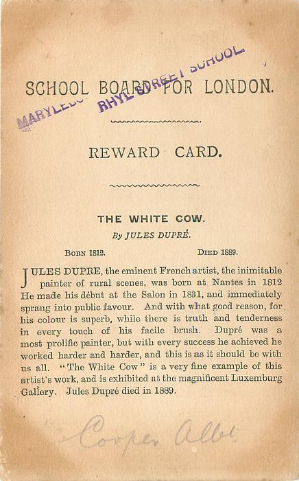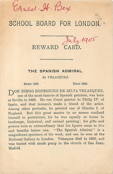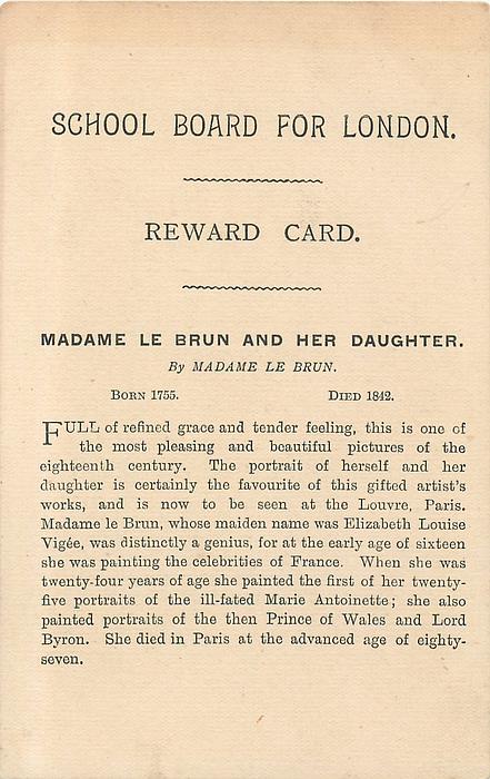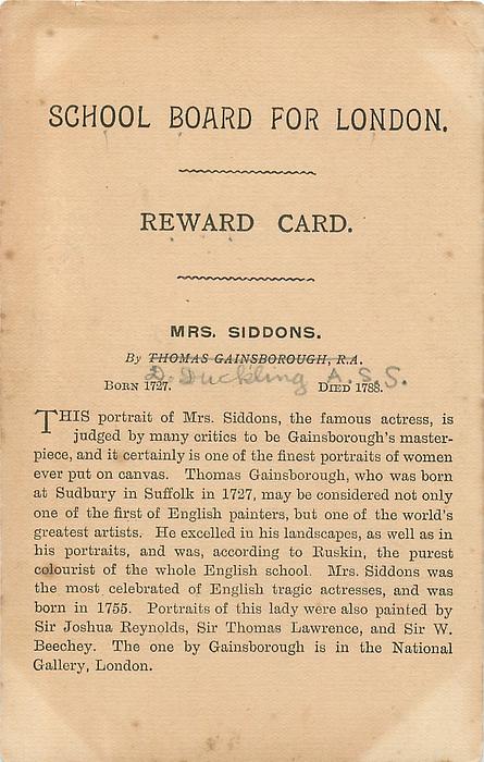 SCHOOL BOARD FOR LONDON REWARD CARD (on back with much information), , art cards from galleries