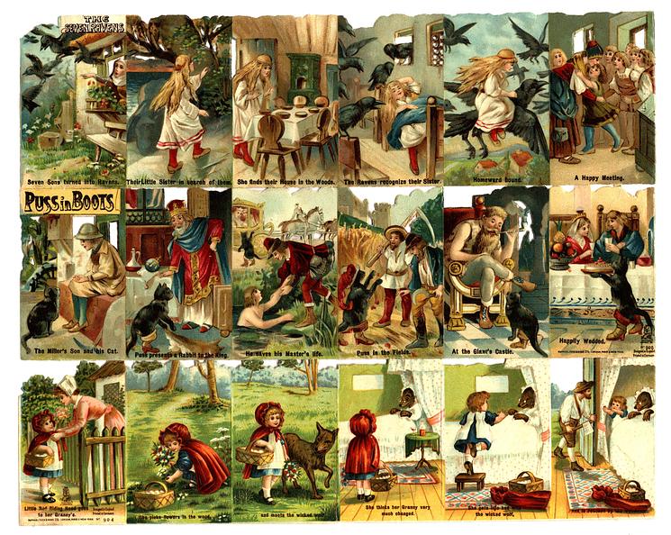 strips of six panels complete one story, three strips or stories per sheet, complete sheet contains LITTLE RED RIDING HOOD, THE SEVEN RAVENS, PUSS IN BOOTS and is pictured on page 97 of THE HISTORY OF PRINTED SCRAPS BY ALISTAIR ALLEN & JOAN HOVERSTADT,