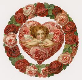 Rose wreath, suspended Valentine cupid with bow,