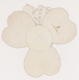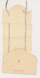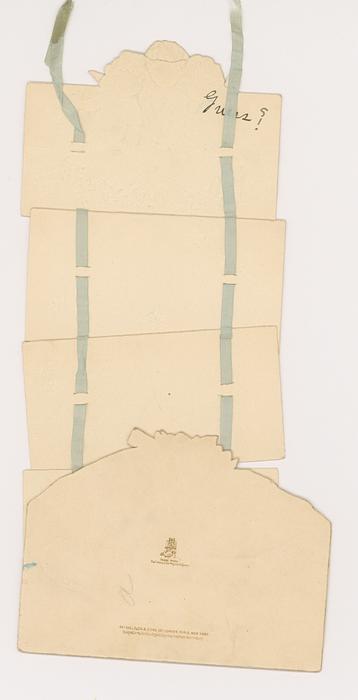 four panels connected with ribbon and designed to hang, come out of the envelope, the last panel is attached to the envelope inside