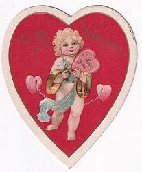 TO MY VALENTINE, Cupid carrying a valentine heart, two gold rings, chains to hearts in background