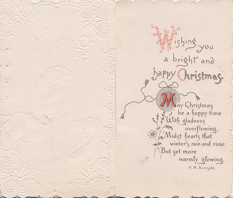 die-cut single sheet, single fold, irregular edges on 3 sides inside right, top:- A BRIGHT AND HAPPY CHRISTMAS below:- ' TIS CHRISTMAS DAY, AND SO ONCE MORE FOR YOU I WISH THE TRUEST GOOD - MAY CHRISTMAS IN ITS BLITHEST MOOD ALL GRACIOUS GIFTS UPON YOU POUR