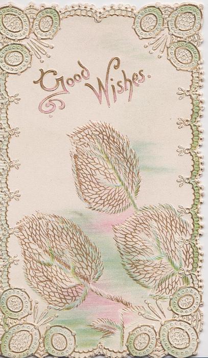 die-cut cover & sheet secured with wool, both single folded, slightly irregular edges first page right, below:- TO OPEN A GOLDEN CENTURY second page right top:-"PAST AND PRESENT WOUND IN ONE DO MAKE A GARLAND FOR THE HEART" middle:- WITH ALL GOOD WISHES FOR A HAPPY CHRISTMAS FROM same front title & design comes with different greeting