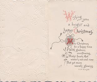 die-cut single sheet, irregular edges on 3 sides inside right top:- A HAPPY CHRISTMAS below:- I WISH YOU HOPE AND JOY ENOUGH TO SPEED YOU ON YOUR WAY, WITH LOVE TO SMOOTH ALL PATHWAYS ROUGH - A HEART CONTENT AND GAY, AND ENOUGH OF WEALTH FOR MANY A CHRISTMAS DAY