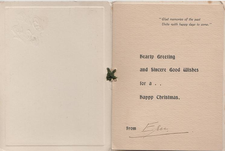 die-cut cover & sheet secured by ribbon, single folds, embossed inside first right:-WITH ALL GOOD WISHES FOR A HAPPY CHRISTMAS FROM second:-AGAIN A GREETING AND AGAIN THE SAME OLD WISH, SAME OLD STRAIN, "A CHRISTMAS BRIGHT, A GLAD NEW YEAR, AND TROOPS OF FRIENDS TO HOLD MOST DEAR" back:-EIN FROHLICHES UND GRFEGNETES WEIHUACHTSFELT WUNFCHEN HERZLICHFT GRUZEND PAFTOR HAEFUER U. FAMILIE
