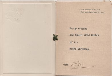 oblong sheet single folded inside right top;-MAY HOPE AND HAPPINESS UNITE TO MAKE YOUR CHRISTMAS TRULY BRIGHT. below:-CHRISTMAS GREETINGS AND ALL KIND REMEMBRANCE. FROM
