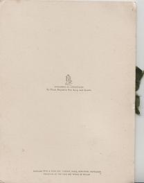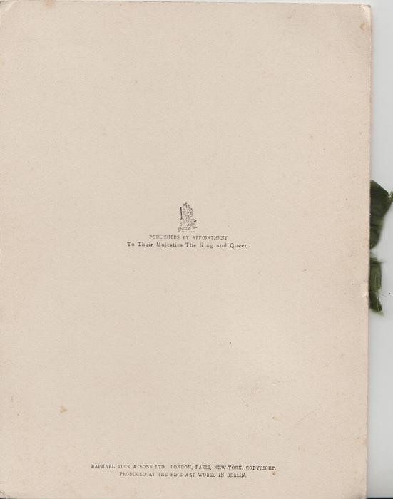 Tuck logo above PUBLISHERS BY BY APPOINTMENT TO THEIR MAJESTIES THE KING AND QUEEN ALEXANDRIA RAPHAEL TUCK & SONS LIMITED. LONDON, PARIS, NEW YORK DESIGNED AT THE STUDIOS IN ENGLAND AND PRINTED AT THE FINE ART WORKS IN BAVARIA