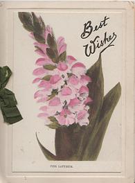 oblong cover & sheet secured by ribbon, single folds,very heavily embossed inside first right:- WHEN THESE FAIR FLOWERS YOU SEE I WOULD HAVE YOU GIVE A THOUGHT TO ME second right:- WITH BEST WISHES FOR A BRIGHT AND HAPPY NEW YEAR same front design but different front & inside greetings