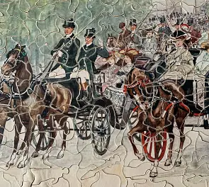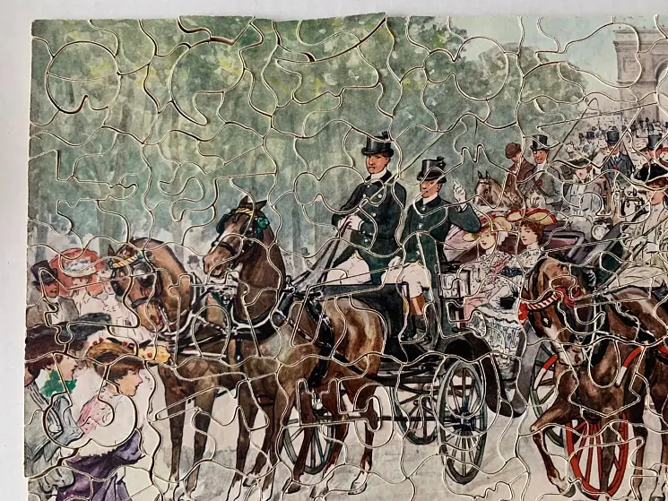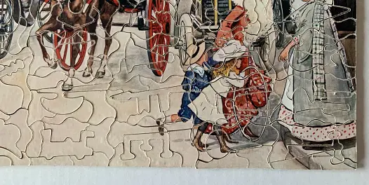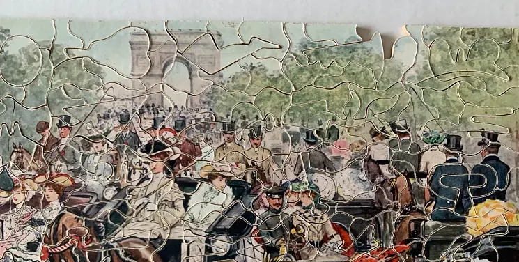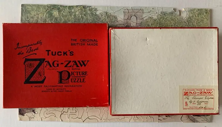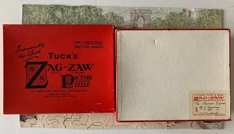 Zag-Zaw line of puzzles was first produced in 1909, all incorporate figurals or whimsies, sold in red or orange boxes with labels on the side or bottom of the box, most without guide pictures. Initially cut non-interlocking but by 1930's became more so. Puzzles have a different cuts so that the same image will come in several versions which means that missing pieces can not be taken from other puzzles with the same image. See also Bob Armstrong's website on old jigsaw puzzles