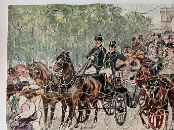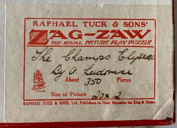 Zag-Zaw line of puzzles was first produced in 1909, most incorporate figurals or whimsies, sold in red, orange, or occasionally green boxes with labels on the side or bottom of the box, most without guide pictures. Initially cut non-interlocking but by 1930's became more so. Puzzles have a different cuts so that the same image will come in several versions which means that missing pieces can not be taken from other puzzles with the same image. The puzzle labels are often hand written and come with minor variations in titles and details. Some have a DESIGN catergory on the label. From my readings this refers to the style of cut, wavy lines, figurals, etc. See also Bob Armstrong's website on old jigsaw puzzles